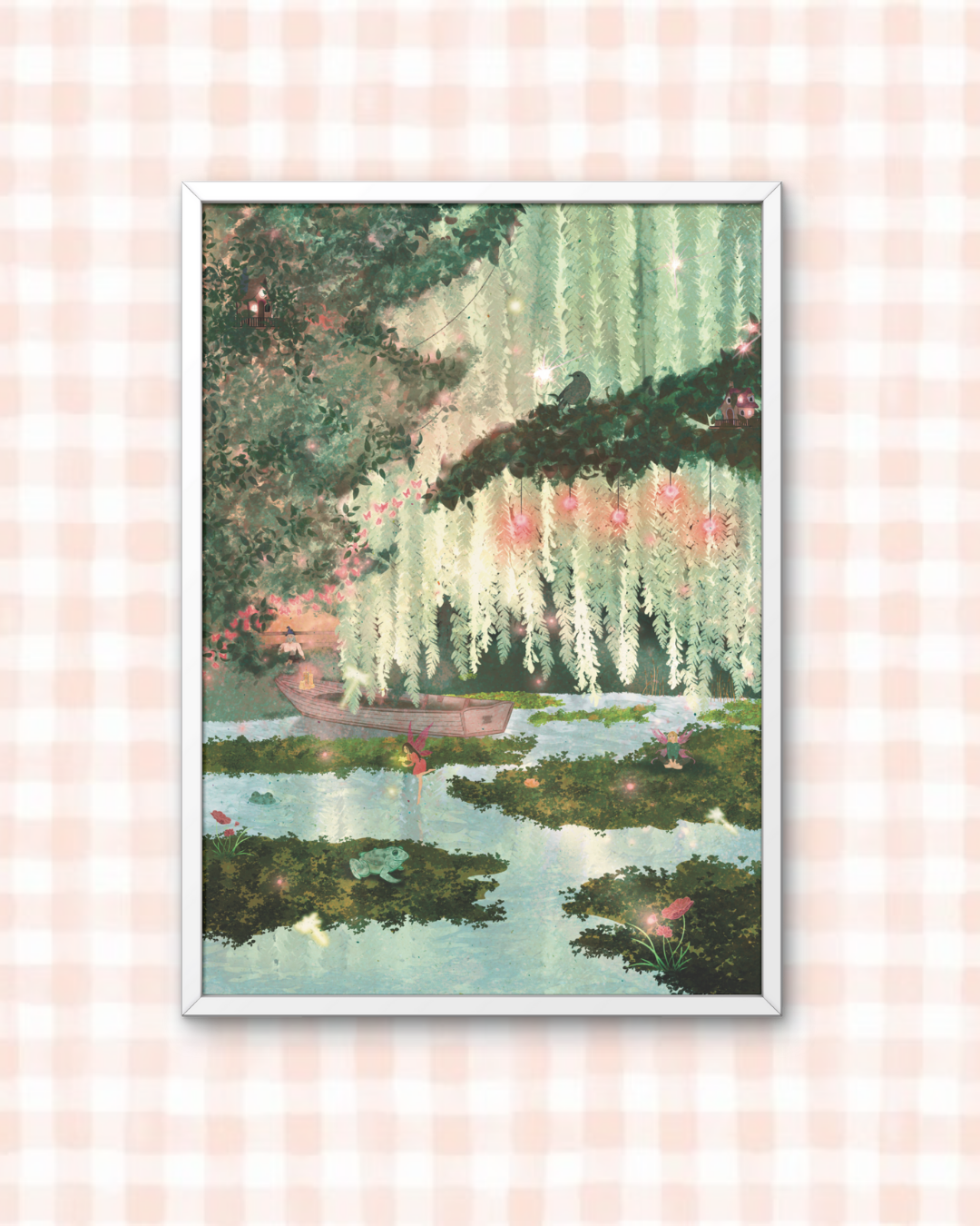 Sous les branches tombantes des saules, une forêt lumineuse s’étire au bord de l’eau. Des fées discrètes veillent, entourées de reflets aquatiques, de feuillages suspendus et de petites lumières scintillantes. Cette scène onirique invite à la rêverie, au calme et à l’évasion.