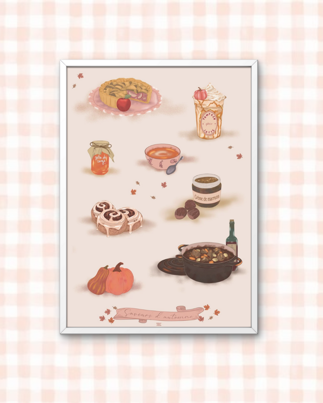 Tarte aux pommes, pumpkin spice latte, confitures, roulés à la cannelle, soupe chaude, crème de marrons, citrouilles et plat mijoté… chaque élément illustré évoque les goûters réconfortants, les cuisines parfumées et les moments cosy lorsque les feuilles tombent. Une composition douce et détaillée, pensée comme une ode aux saveurs et aux ambiances d’automne.